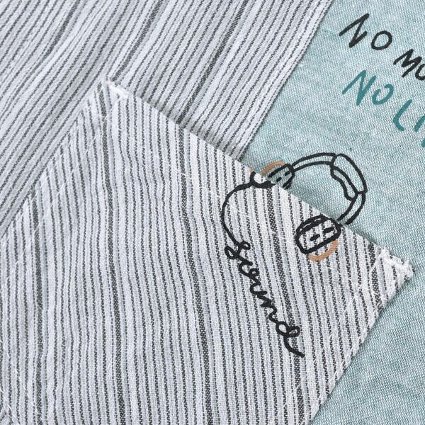 後ろ身頃はストライプガーゼとダンガリーの切替になっているので、バックスタイルもカッコよく決まる1着。