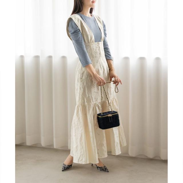 女性らしいシルエットを引き立てるジャガード素材を使用したマーメイドラインのジャンバースカート