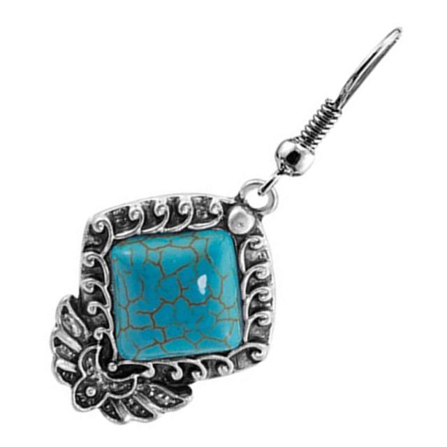 四角形のウエーブ(波)をデザインした銀色シルバーの台座にスクエアの天然石風のイミテーションのターコイズにエスニックなチャームが揺れるボヘミアンスタイルのステンレスピアス。