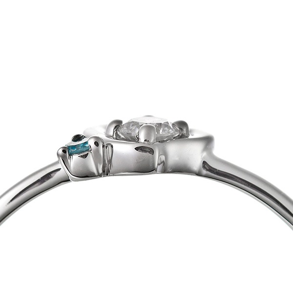 天然のダイヤモンドを使用し、プラチナ950の台座に合計0.06ctの天然ダイヤモンドをセッティングしてあります。脇にはアイスブルーダイヤモンドがセットされた可愛らしいプラチナリングです。