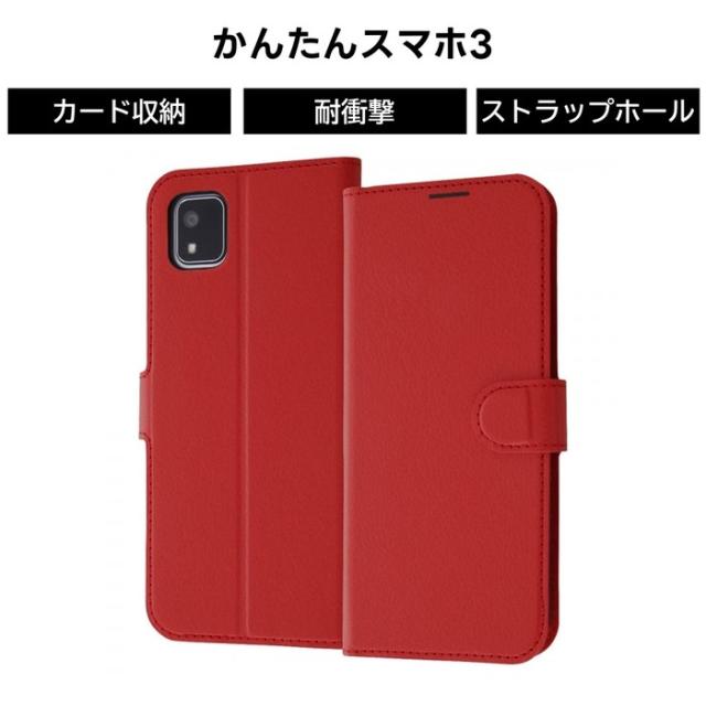 かんたんスマホ3 耐衝撃 手帳型レザーケース シンプル マグネット ルーペ付/レッド。