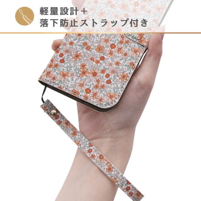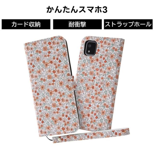 かんたんスマホ3 耐衝撃 手帳型レザーケース 花柄 ストラップ付/花柄/オレンジ。