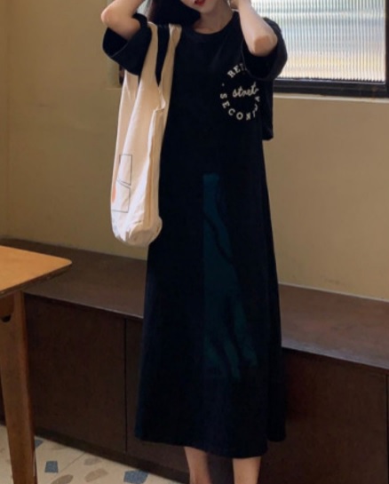 ロングワンピース 細見え 夏 普段使い ルーム お出かけ デート 黒 ラウンドネック スリット 背中開き セクシー 大きめ ロゴ 大人 キュート 可愛い クール シンプル 個性的 ゆったり Aライン 半袖 ミモレ丈 人気 トレンド 10代 20代 30代