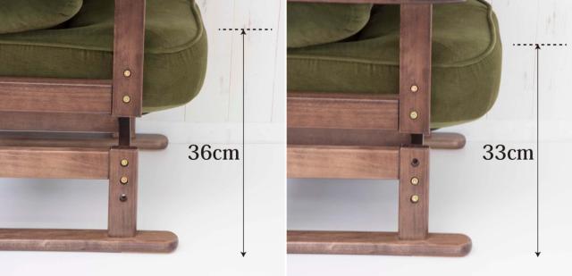 座面の高さを約33cmと36cmに調整可能です。テーブルの高さや体格に合わせて、最適な高さに設定できます。