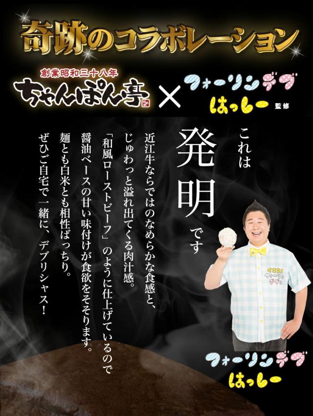 フォーリンデブはっしーさんが、近江ちゃんぽん発祥の店『ちゃんぽん亭』と共同開発したのが、こちら。近江牛の肉汁を逃さず、中はレアに焼き上げた。しっとりなめらかな舌触りに陶然となる。醤油ベースの甘い味付けで赤身肉の旨みと風味を引き出した名品だ。