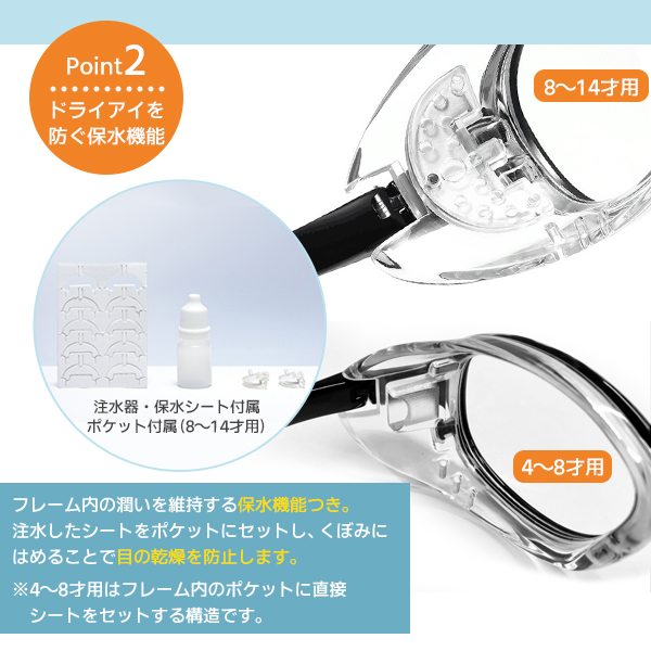 目の潤いを保つ保水機能つき。便利な保水セットと落下防止ストラップも付属します。