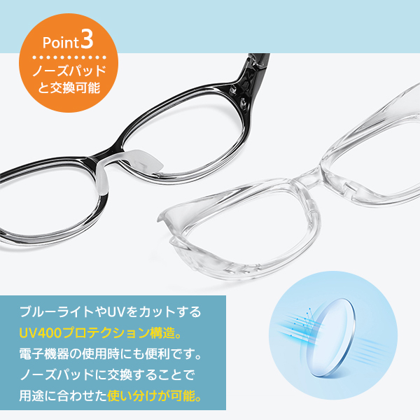 レンズは目に有害なUVやブルーライトをカットしてくれるので電子機器の使用時などにも役立ちます。