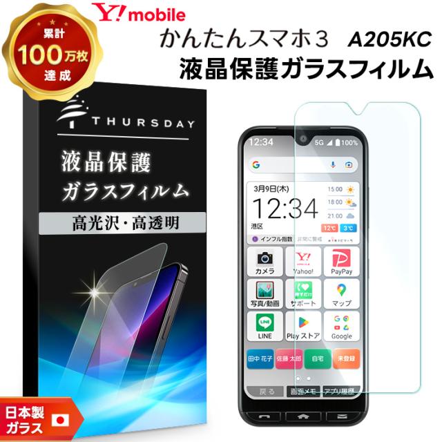 かんたんスマホ3 A205KC ガラスフィルム 強化ガラス 液晶保護 保護 強化ガラス スマホ スマートフォン 携帯フィルム 飛散防止 指紋防止 硬度9H 2.5Dラウンドエッジ加工 Y!mobile ymobile ワイモバイル 京セラ シニア向け 初めてスマホ AGC日本製ガラス 透明 クリア
