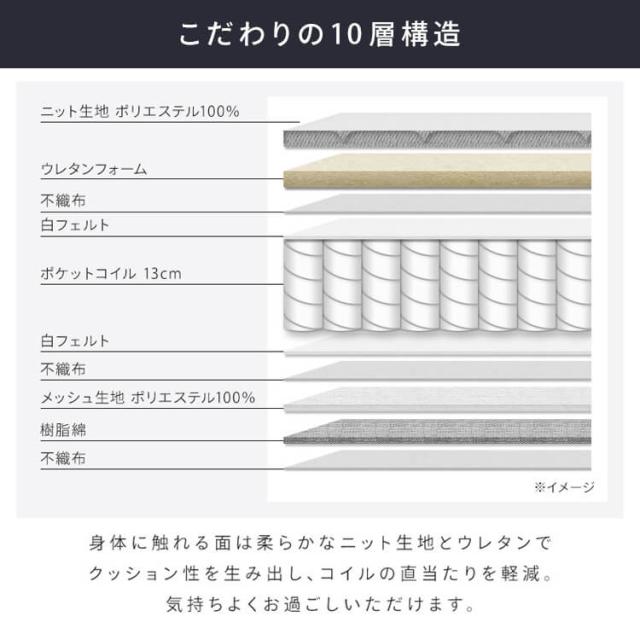 こだわりの10層構造を採用し、薄型タイプでも快適な寝心地を実現。
