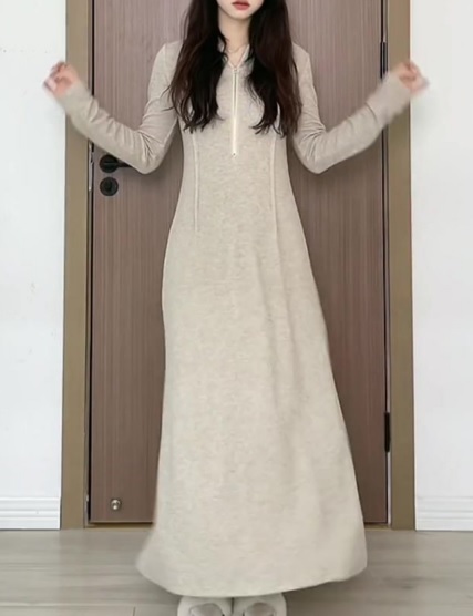 ロングワンピース 細見え 春 秋 普段使い ルーム お出かけ デート グレー Vネック 大きめ 無地 大人 カジュアル 可愛い ラフ シンプル ゆったり Aライン 長袖 ショート丈 マキシ丈 人気 トレンド 10代 20代 30代