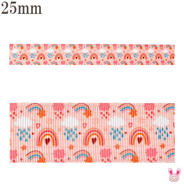 25mm プリントリボン 虹とハートのピンクリボン 2m [在庫限り]