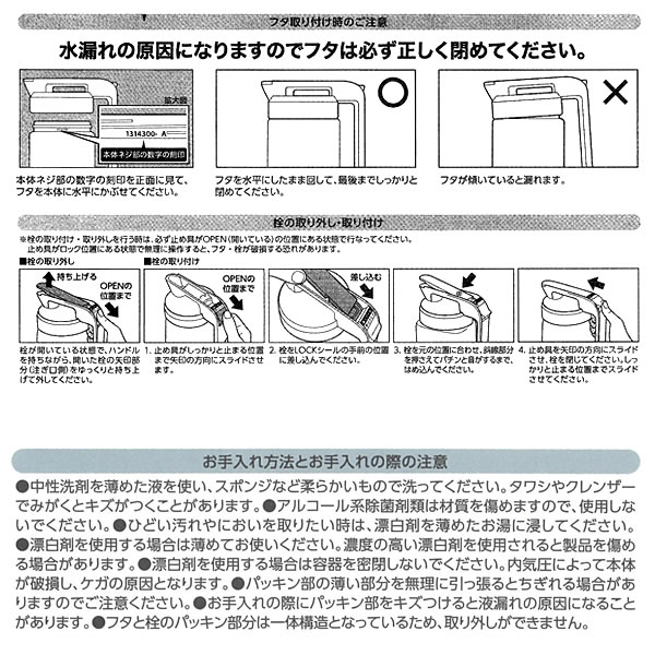 材質:本体/AS樹脂 止め具/ABS樹脂 フタ/PP、熱可塑性エラストマー 栓/ABS樹脂、シリコーンゴム