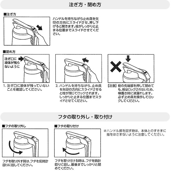片手でオープン・片手でロックロック解除、注ぎ口の開閉が片手で行えて操作ラクラク。