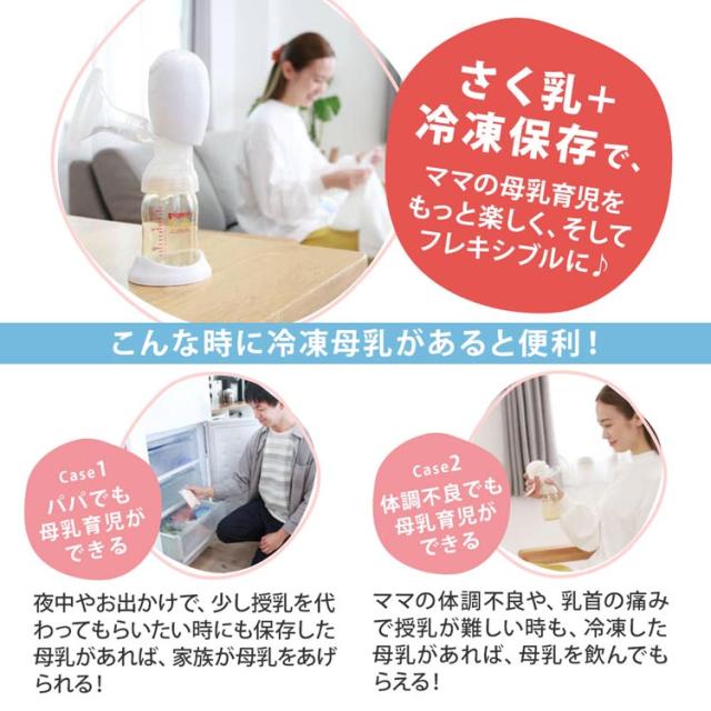 | ・内容:母乳フリーザーパック40ml 50枚、シール 50枚 ※シールはお名前やさく乳量、さく乳した日時を記入できます。 ・保存期間:さく乳直後の母乳を冷凍保存する場合、6ヵ月まで保存可能ですが、3ヵ月を目安にご使用いただくことをおすすめします。 |