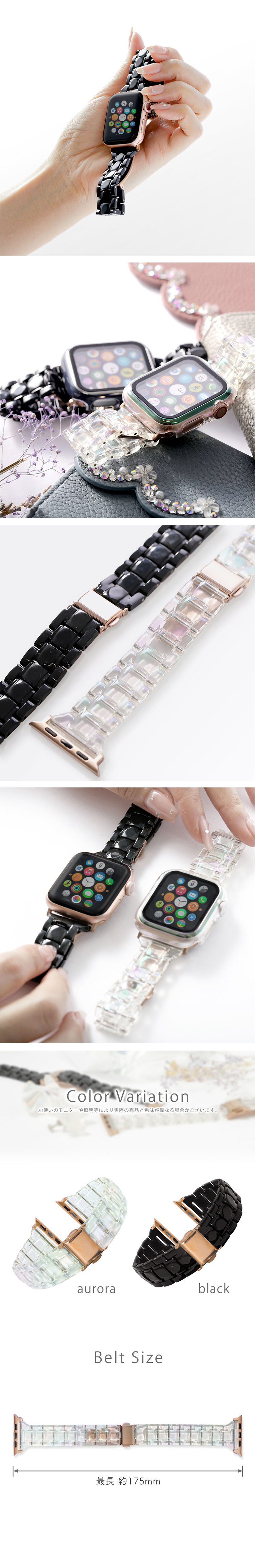 どんな服装にも合うブラック、クリアオーロラのapplewatchバンド。