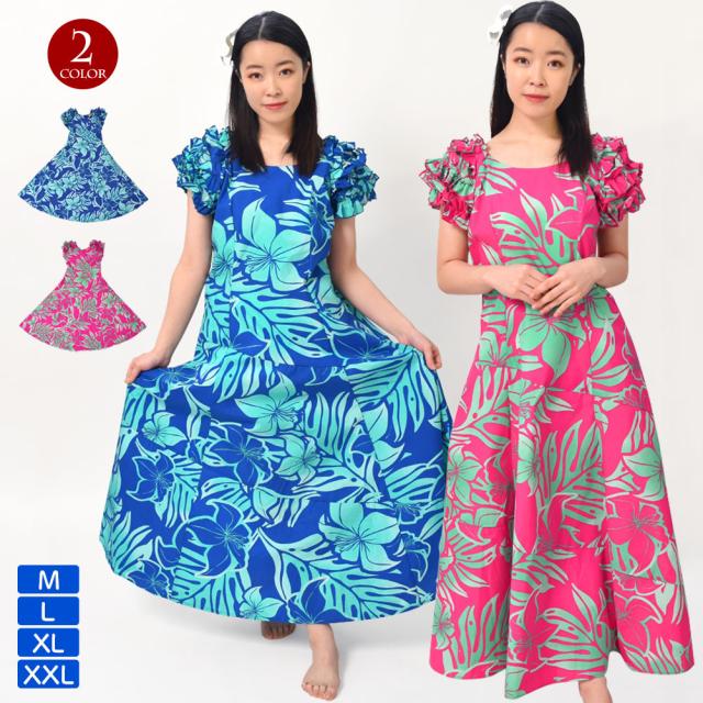 フラダンス衣装 ハワイアンドレス フラワンピース フラドレス フラ衣装 JB29G10[新品] ハワイ リゾートウェア ハワイ柄 モンステラ ハイビスカス イベント 発表会 袖フリル /綿混/ロング/半袖/ファスナー/ブルー/チェリーピンク