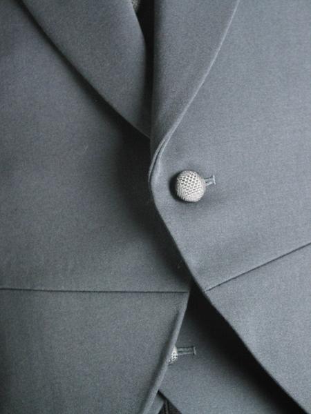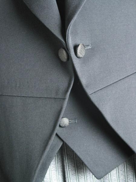 ★シルバータイ華やかなアスコットタイも可。 又は白黒のストライブ。葬儀には黒のタイに。 ★ウイングカラーシャツ 立ち襟で先を前に折り曲げたシャツ。 普通のレギュラーシャツでも構わない ★黒ベスト 慶事の時は黒ベストに白襟を付けるのが良い。 ★手袋 白の手袋を持っているだけでも良い ★コールズボン ストライブの入ったモーニング用のパンツ。 ベルトは使わずサスペンダーを使用する。 ★シューズ ストレートチップ又はプレーントウ ![]() ▼弔事は通常釦 ![]() ▼慶事は拝み釦 ![]() |