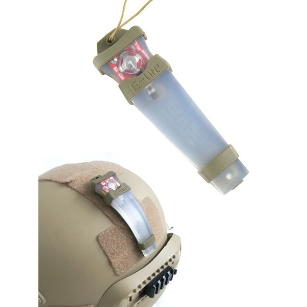 柔軟性があるのでヘルメットの曲面にしっかり密着出来ます。その他にモールに刺したり、付属のストラップで首から提げて使用出来ます。スイッチを押すごとに点灯/点滅/OFFの順で切り替わります。