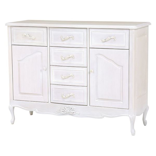 商品仕様: 〔開梱設置サービス付〕 ワイドキャビネット リビング収納 幅120cm 木製 引き出し 扉 脚付き 姫系 アンティーク風 ハンプトンシリーズ リビング