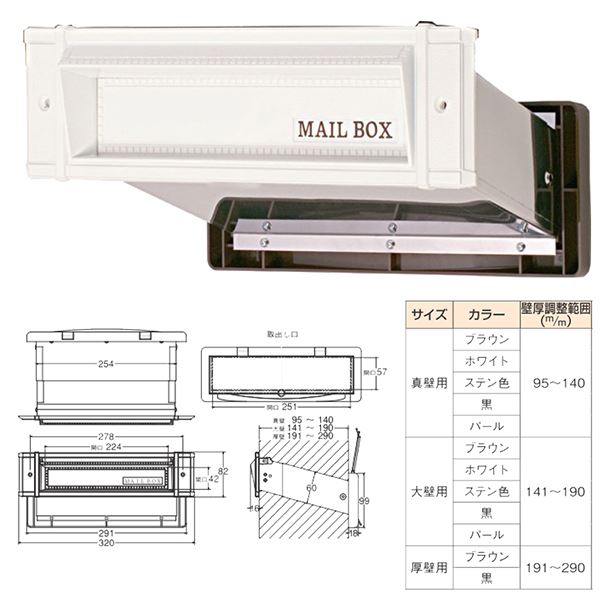 【サイズ・耐荷重】受口部:幅(mm)320 高さ(mm)82 取出し口開口寸法:幅(mm)251 高さ(mm)57 壁厚調整範囲141〜190mm