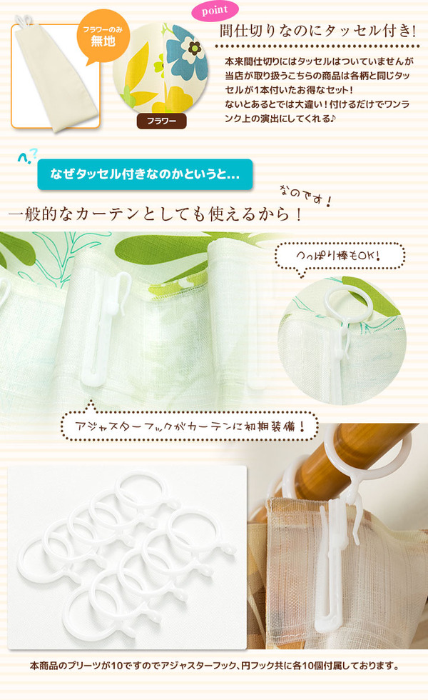 内容物:間仕切りカーテン1枚、アジャスターフック10個、リングランナー10個、タッセル1枚