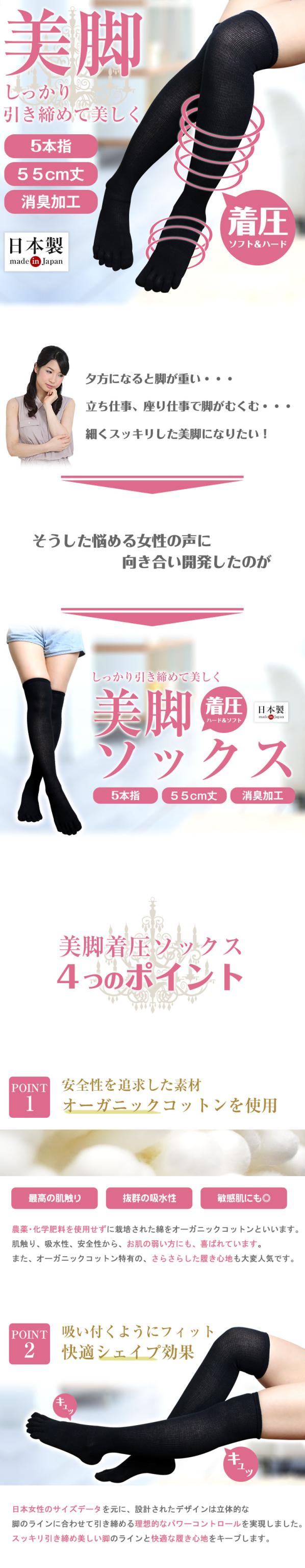 着圧ソックス ニーハイソックス 5本指 消臭靴下 55cm 日本製 オーバーニー ハイソックス 靴下 綿100% オーガニックコットン 黒 5本指ソックス 着圧 むくみ解消 冷え対策 弾性ストッキング 弾性ソックス 医療用 消臭 圧力 夜間頻尿 ルームソックス 敬老の日 長め