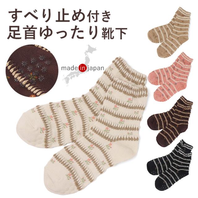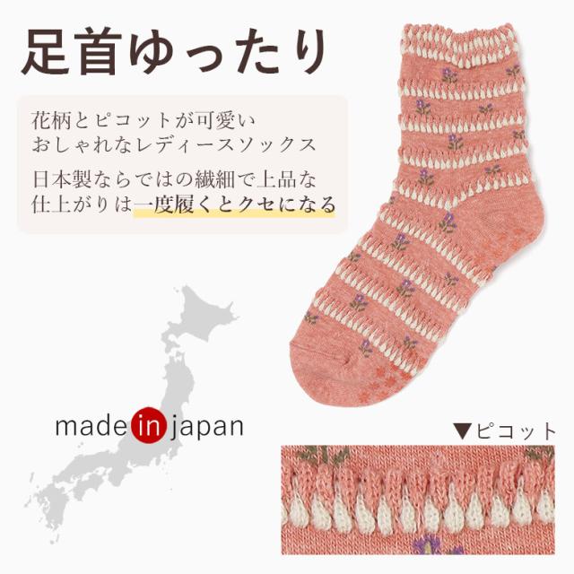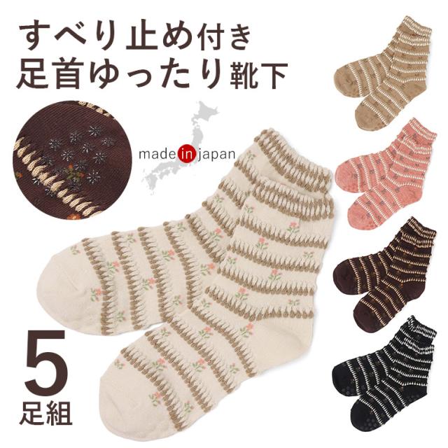 靴下 レディース 5色セット 可愛い かわいい すべり止め 滑り止め 口ゴムゆったり ピコット 花柄 くつした レディースソックス ソックス 日本製 防寒 履き 口 足首 ゆったり 介護 ゴム の ゆるい ゴムなし みたい 介護用靴下 むくみ 高齢者 足のむくみ 大人 シニア 婦人 女性