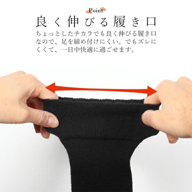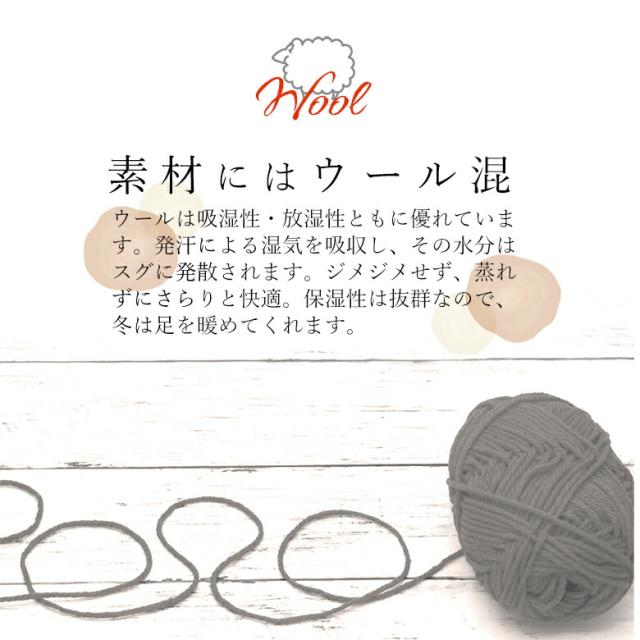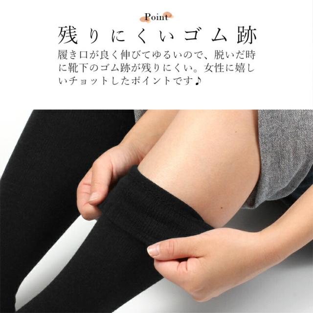 履き口ゆったりで足を締め付けない ずーっと快適 足に合っていない靴下を履いてしまい締め付けがきつくて傷みを感じる場合は、 血流を阻害してむくみの原因になったり、足先の冷えに繋がったりする原因になるかもしれません。 ■良く伸びる履き口 ちょっとしたチカラでも良く伸びる履き口なので、足を締め付けにくい。 でもズレにくくて、一日中快適に過ごせます。 ■残りにくいゴム跡 履き口が良く伸びてゆるいので、脱いだ時に靴下のゴム跡が残りにくい。 女性に優しいチョットしたポイントです♪ ■素材にはウール混 ウールは吸湿性・放湿性ともに優れています。 発汗による湿気を吸収し、その水分はスグに発散されます。 ジメジメせず、蒸れずにさらりと快適。 保温性は抜群なので、冬は足を暖めてくれます。 ■ずーっとあったか 長さが膝下まであるので、冷えるアナタの足元をずーっとじんわり暖めます。 |