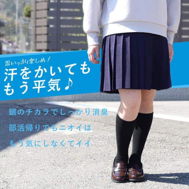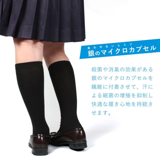 銀のチカラでニオイとサヨナラ! 爽快消臭スクールソックス 殺菌や消臭の効果がある銀のマイクロカプセルを繊維に付着させて、汗による細菌の繁殖を抑制し快適な履き心地を持続させます。 ひざ下丈の長さ38cm。 |