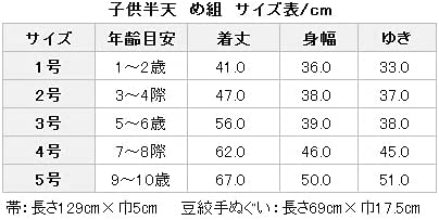 | サイズ/寸法 | 1号 1~2才 身長目安:90㎝ 着丈:41㎝ 身巾:36 ㎝ ゆき:33㎝ 2号 3~4才 身長目安:100㎝〜110cm 着丈:47㎝ 身巾:38㎝ ゆき:37㎝ 3号5〜6才 身長目安:110cm〜120cm 着丈:56㎝ 身巾:39㎝ ゆき:38㎝ 帯 長さ:115cm×巾:5cm 豆絞り手拭 長さ79cm×巾16cm |