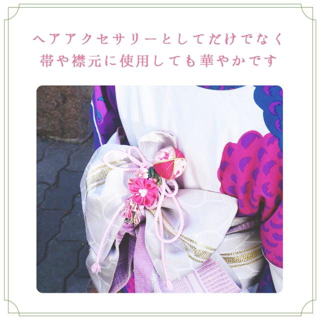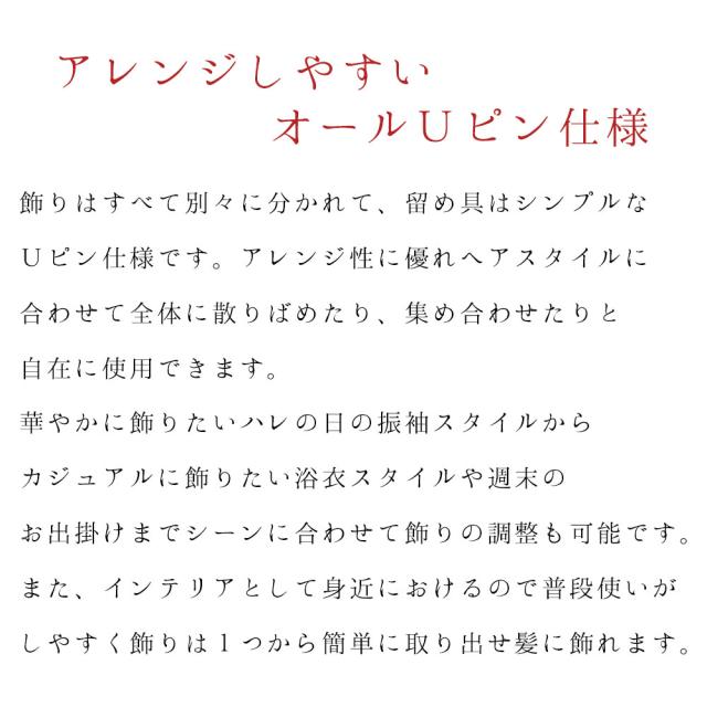 飾りはすべて別々に分かれているので、髪だけではなく襟元や帯に刺したりと多様な使い方も可能です。