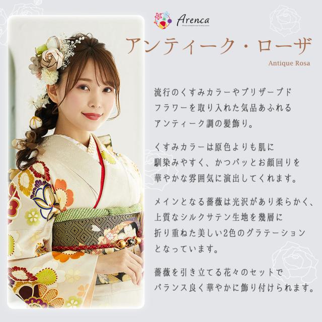 流行のくすみカラーやプリザーブドフラワーを取り入れた気品あふれるアンティーク調の髪飾り。