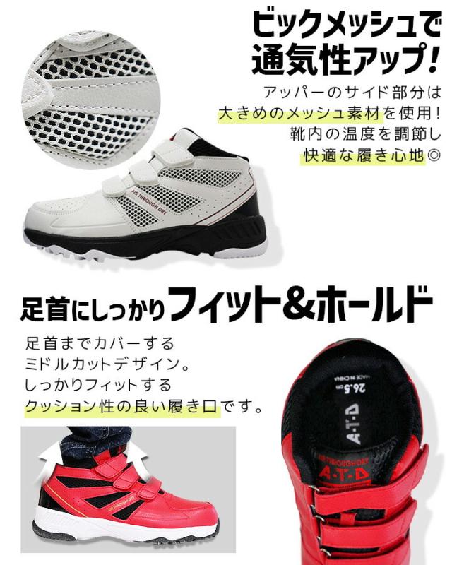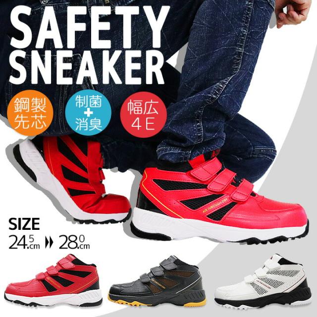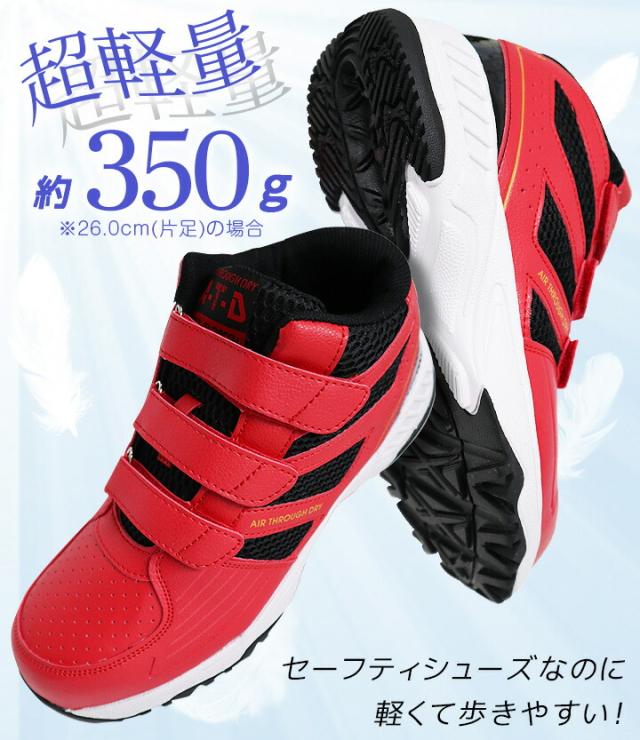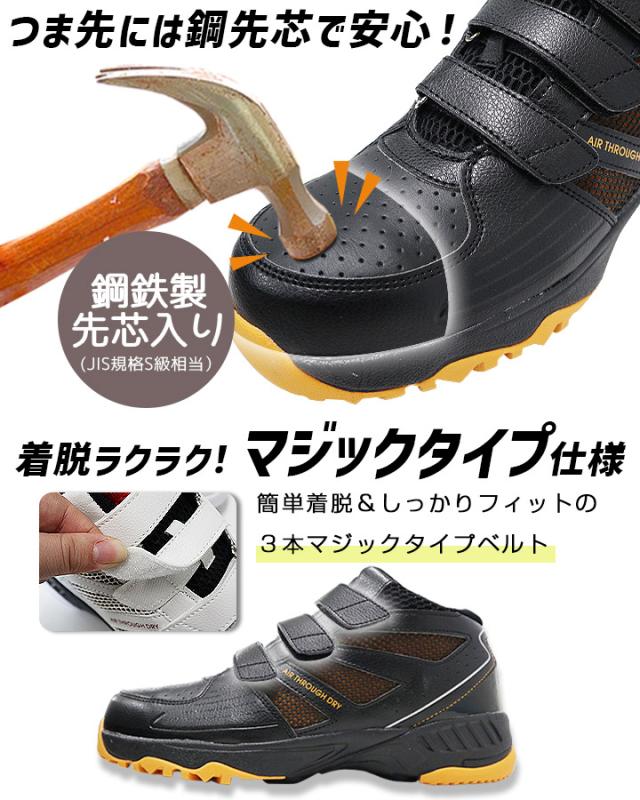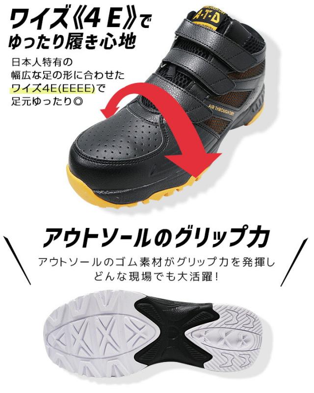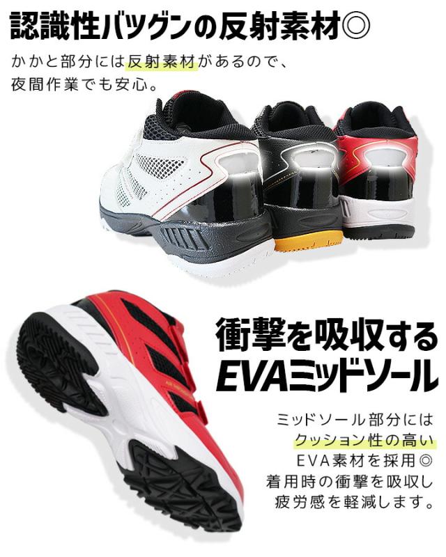 ・超軽量、約350g(26.0cm/片足の場合)・つま先には鋼先芯で安心!・着脱ラクラク!マジックタイプ仕様・ワイズ4Eでゆったり履き心地・アウトソールのグリップ力・認識性バツグンの反射素材・衝撃を吸収するEVAミッドソール・ビックメッシュで通気性アップ・足首にしっかりフィット&ホールド・白金ナノ加工で制菌&消臭インソール