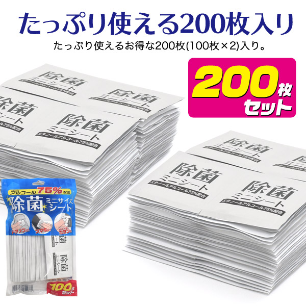 除菌 アルコールシート 200枚入り (100枚×2パック) ミニサイズ エタノールアルコール75%配合 除菌シート 個別包装 持ち歩き コンパクト ウェットティッシュ アルコール除菌 持ち運び 手拭き 使い捨て 送料無料