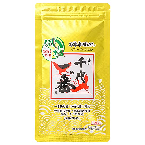 本品は鹿児島県産一本釣り鰹の本枯れ節など、選りすぐりの国内産原料にこだわり、ご家庭で使いやすいように、基本ベースの味をだしパックの中に入れて作り上げた万能和風だしです。面倒な手間をかけることなく煮出すだけ、ふりかけるだけで簡単に美味しい料理が出来上がります。 従来の「万能和風だし千代の一番」の美味しさはそのままに、塩分を30%カットいたしました。和食から洋食まで毎日のお料理にお役立てください。