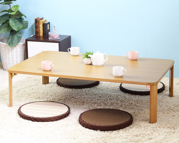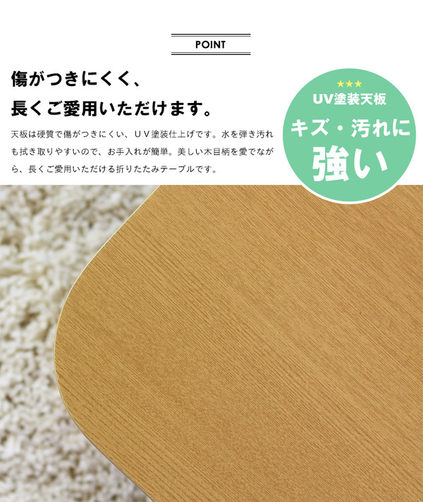 シンプルなデザインとぬくもりのある佇まいが、長く愛されるロングセラーとなっている、木製折れ脚テーブル。和室にも洋室にも合わせやすく、幅広い年齢層、様々なライフスタイルにマッチします。天然木化粧繊維板を使用した天板は、あたたかみのある木目柄。脚部には天然木を使用しています。サイズはファミリー層向けにぴったりの110cm×64cmで、4人程度で囲むように使用できます。