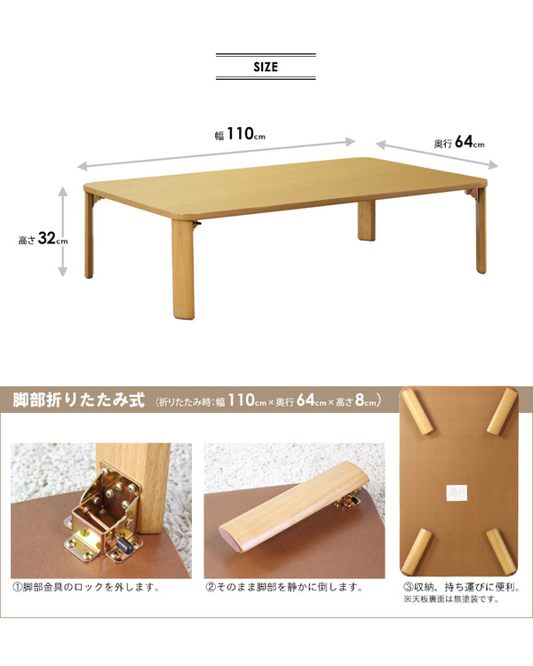 商品仕様: 折りたたみテーブル/ローテーブル 【長方形 幅110cm×奥行64cm】 木目調 天然木脚 ナチュラル【完成品】