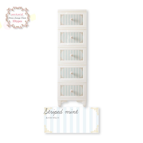 木製家具のようなデザインと多彩なカラーバリエーションが魅力の、まるで変身する魔法のチェスト タンス キャビネット 5段の整理 収納 力でお洋服をスッキリ整理 優雅な猫脚がお部屋に華やかさをプラス 日本製 国産 の姫家具で、おしゃれな整理 収納 を叶えます 衣類整理 収納 タンス 5段 ストライプミント 日本製 国産 猫脚 姫系 ドレスチェンジ チェスト キャビネット Liloudecoco リルデココ 整理 収納 家具 お客様組立品