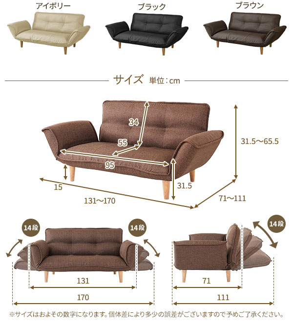 ・通常130cmとコンパクトな横幅なのに、肘掛けを倒すことで最大168cmまで広がります。