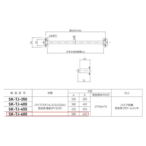 商品仕様: タオル掛け 【SK-TJ600 1本】 取付芯々600mm ステンレス 〔キッチン トイレ バスルーム〕