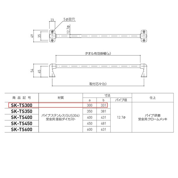 商品仕様: タオル掛け 【SK-TS300 1本】 タオル有効掛幅300mm ステンレス 〔キッチン トイレ バスルーム〕