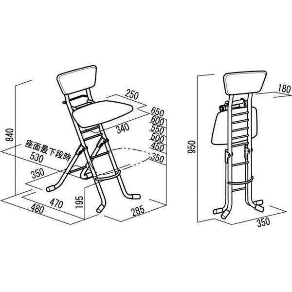 ご利用シーンに合わせて、5cm刻みで35〜65cまで6段階の座面高さ調整が可能。