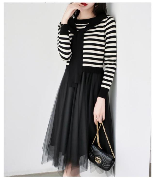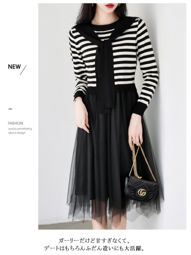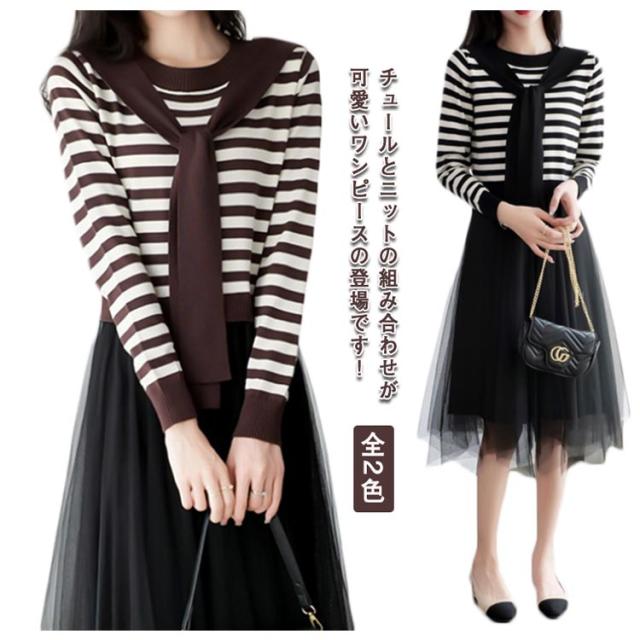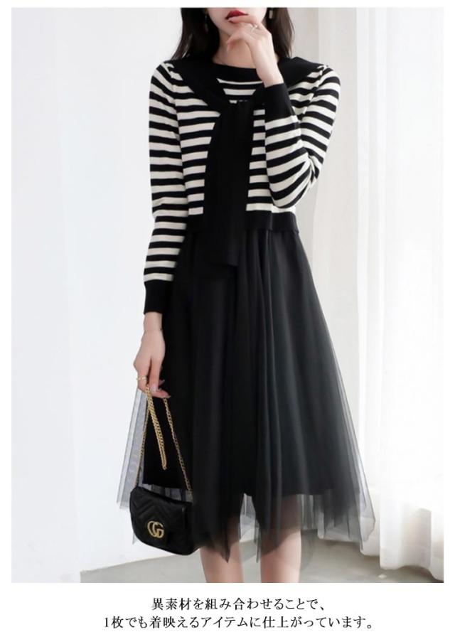 ニットチュールワンピース 切り替え 肩掛け ボーダーニット ボーダー柄 長袖 チュール ドッキング レディース 秋 フェイクレイヤード カジュアル おしゃれ きれいめ 春 異素材