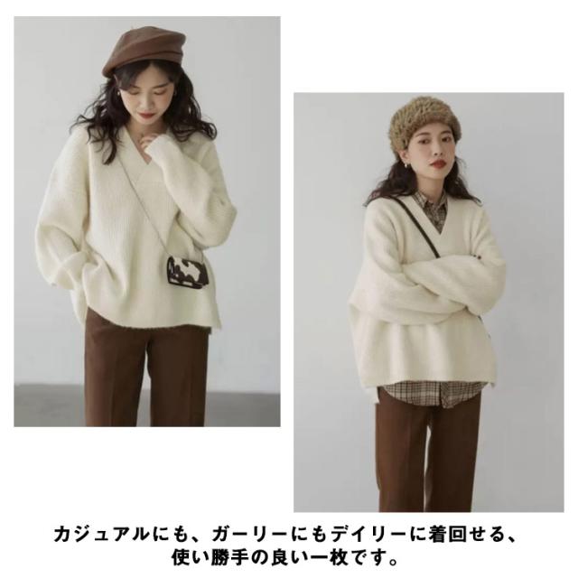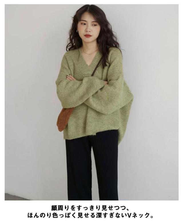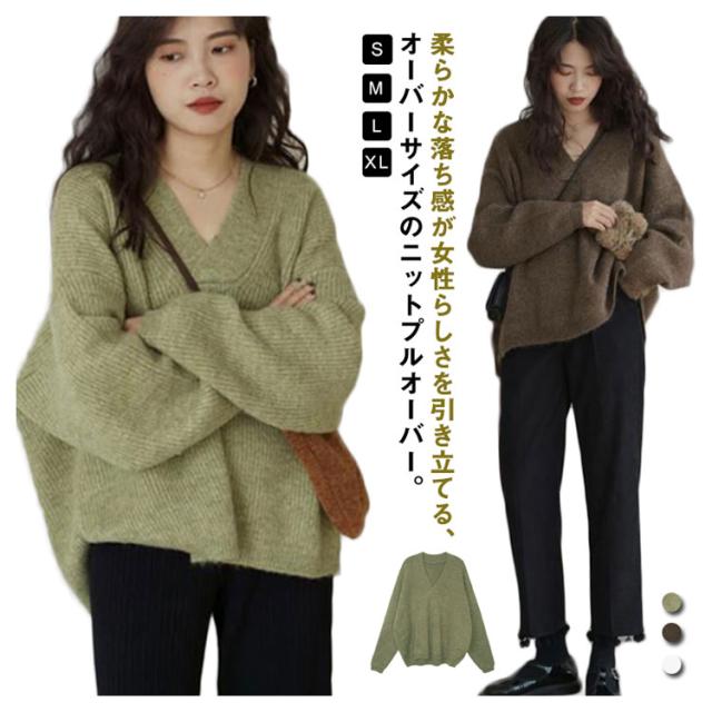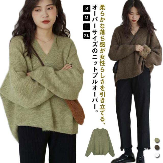 長袖 レディース リブニット ニット プルオーバー 春 ドロップショルダー 春 オーバーサイズ ビッグシルエット ゆったり 大きいサイズ トップス 秋 冬 通勤 カジュアル トレンド レイヤード Vネック