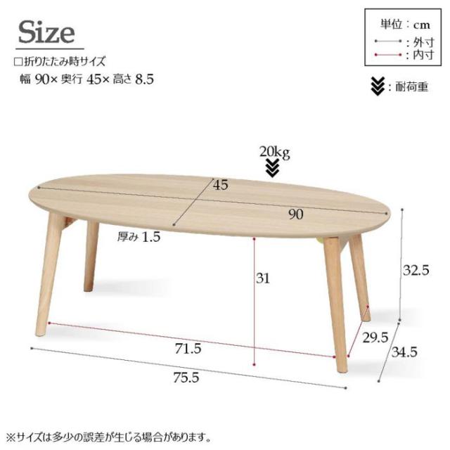 ローテーブル 折りたたみ 木製 オーバル 座卓 幅90 奥行45 完成品 一人暮らし スリム 大きめ 軽量 コンパクト 北欧 リビング ソファ 机 おしゃれ