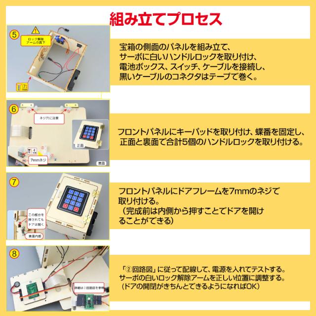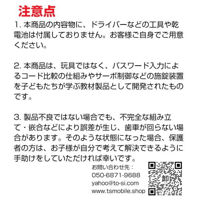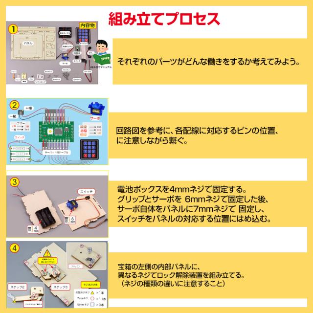 キット内容:組み立てマニュアル、組み立てキット(パネル、キーパッド、電池ボックス、回路基板、ブザー、サーボ、スイッチ、ケーブル、蝶番、ハンドルロック、クリップ、バネ、グリップ、4mmネジ、6mmネジ、7mmネジ、10mmネジ、先端尖りネジ)