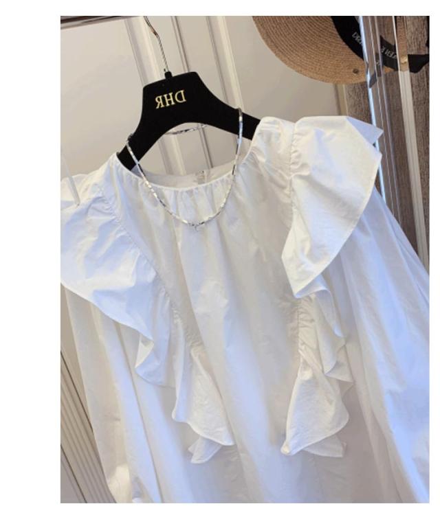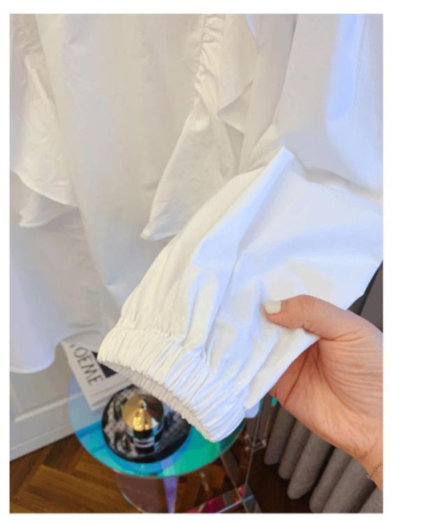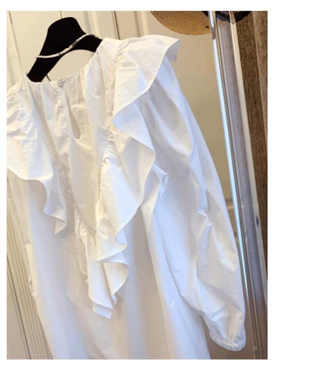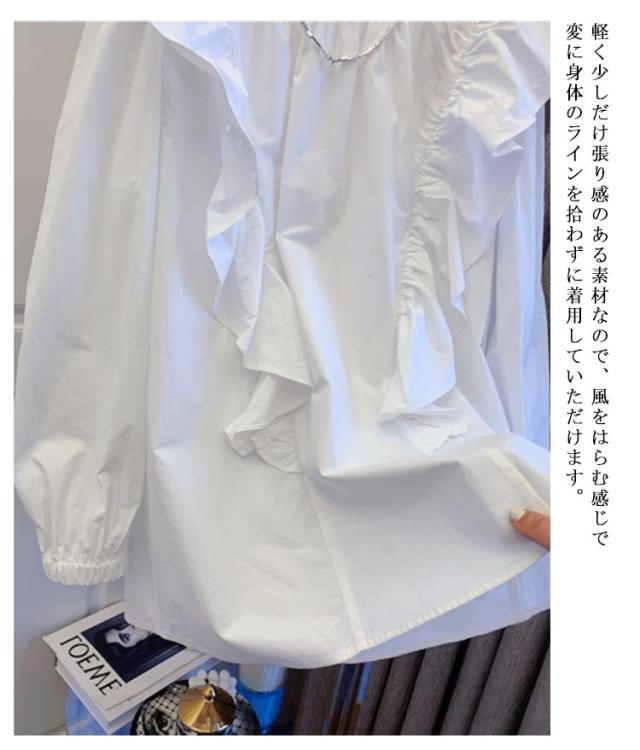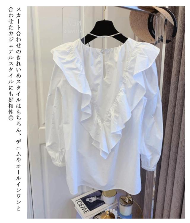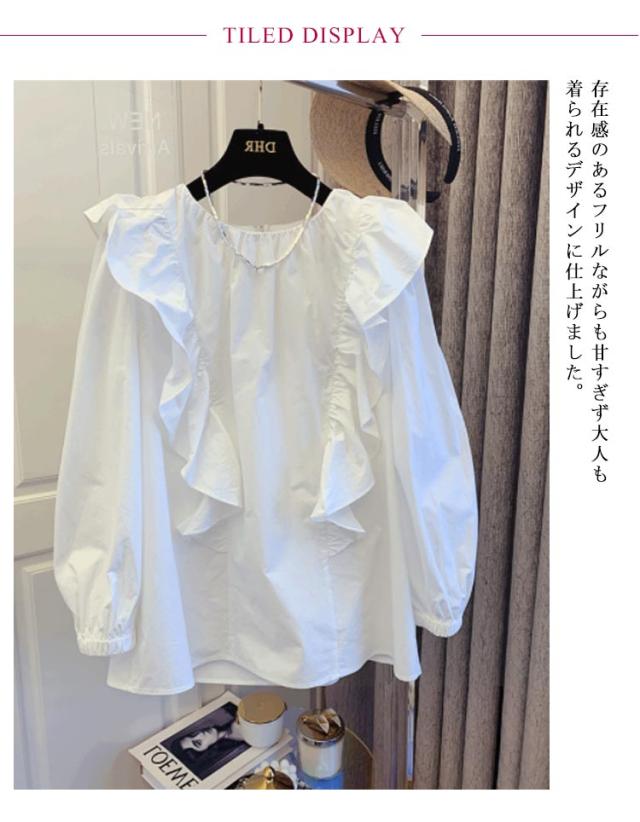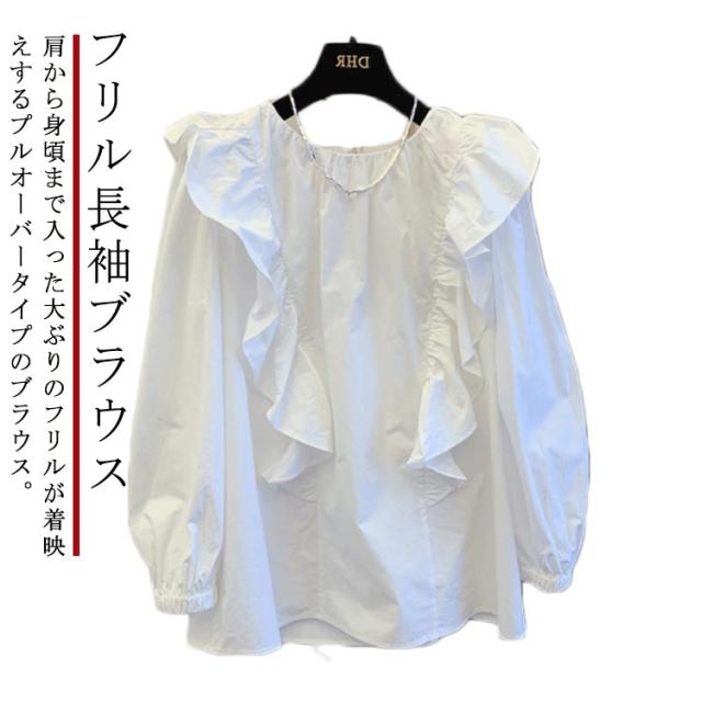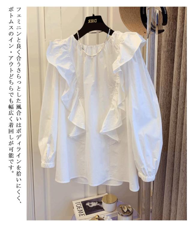 トップス レディース 長袖 フリルブラウス 大きいサイス フリル 無地 ラッフル チュニックシャツ 送料無料 クルーネック ボリューム袖 Tシャツ プルオーバー プルオーバー シャツ ブラウス 白 ホワイト フリル長袖ブラウス