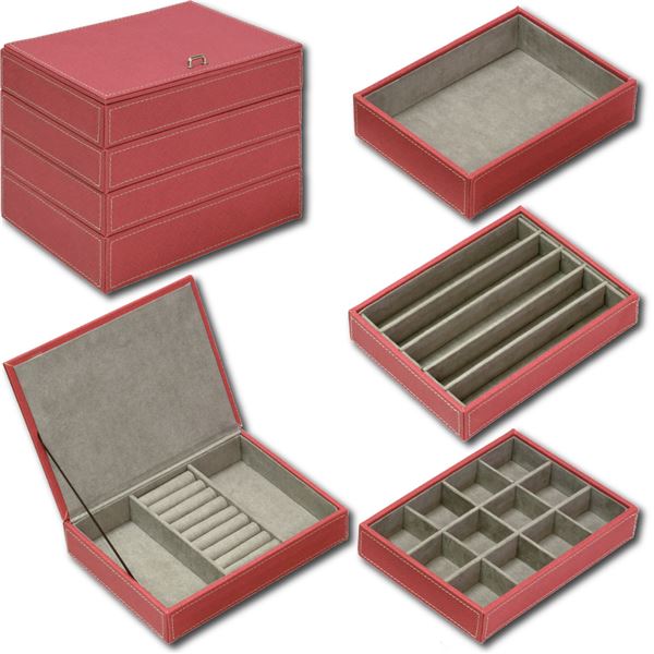 4段ジュエリー 宝石 ボックス ダークピンク 深紅の魅力が溢れる、4層構造のレザージュエリーボックス 送料無料