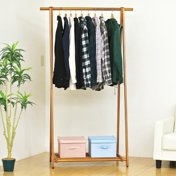 商品仕様: 木製 A型 ハンガーラック/コートハンガー 【ブラウン 茶】 幅102.5cm 棚付き 折りたたみ可 ロングコート可