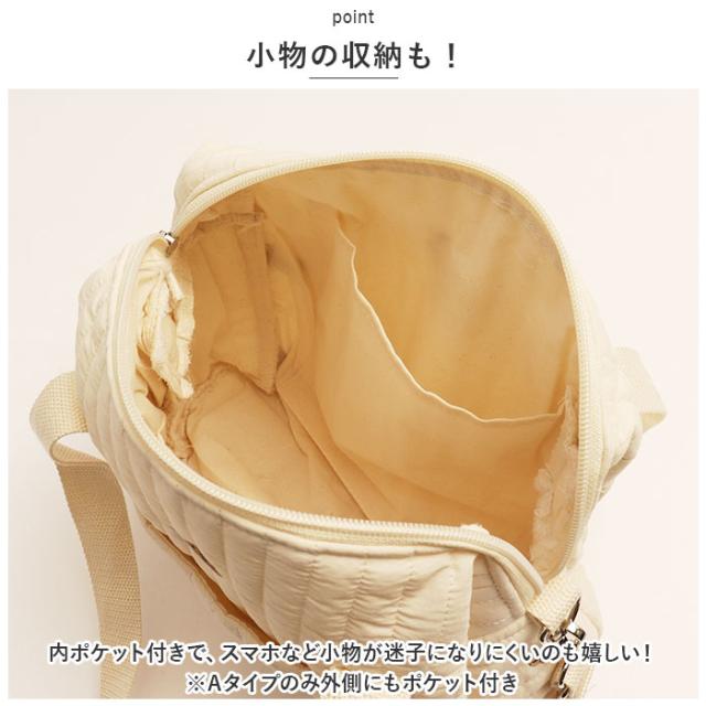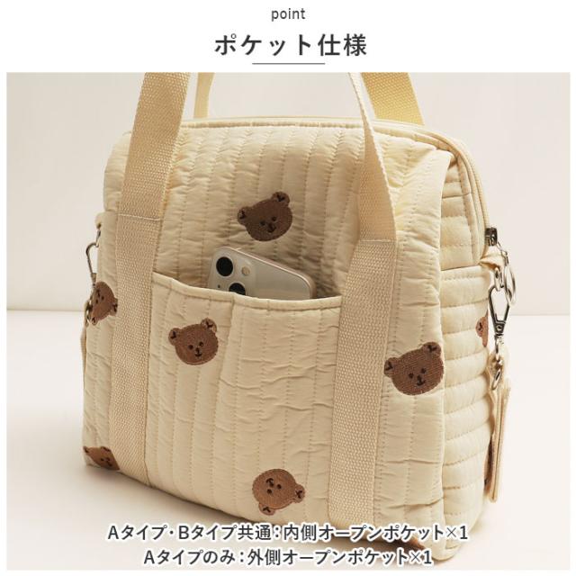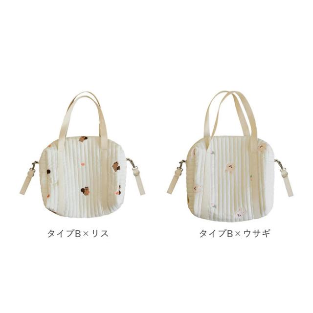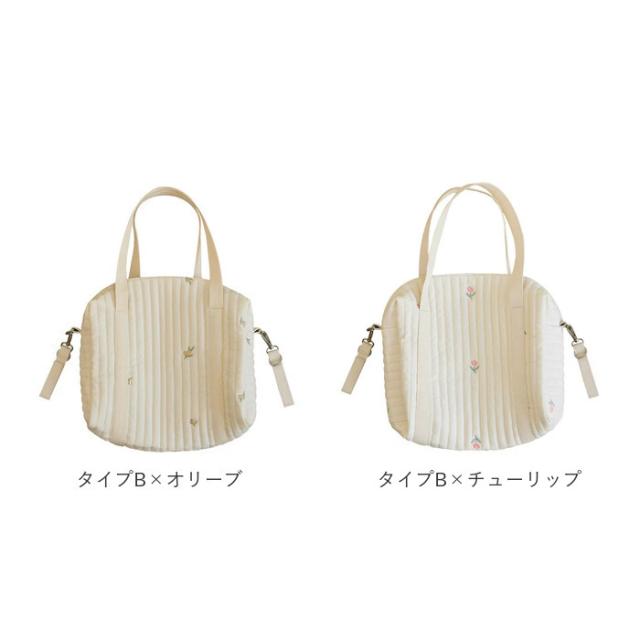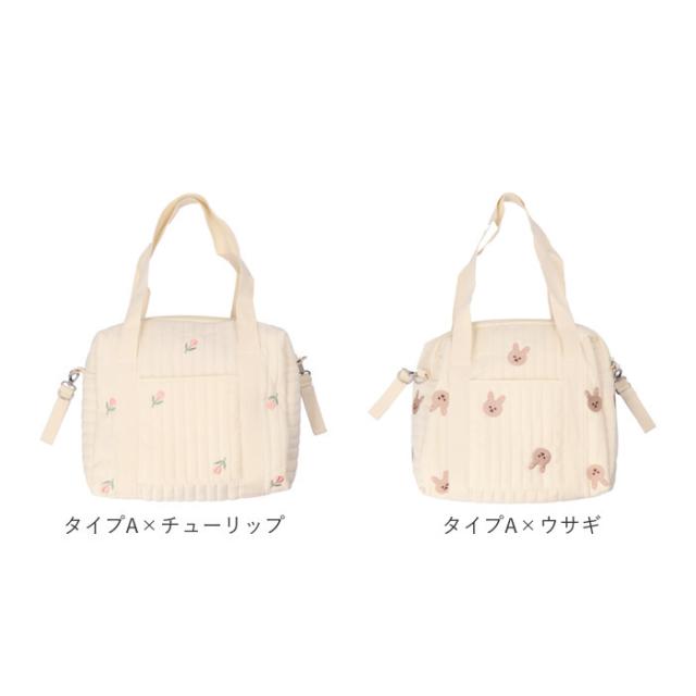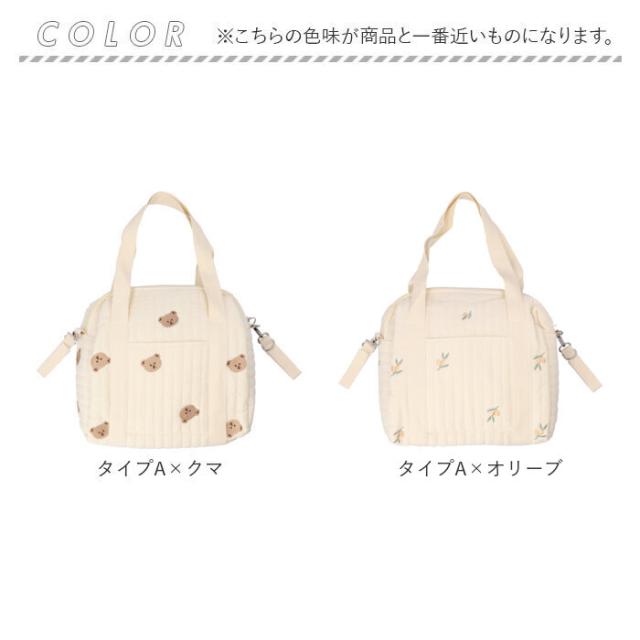 | 商品説明 | ・赤ちゃんとのお出かけもストレスフリー♪ママも喜ぶ3wayタイプのマザーズバッグが新登場。 【ナチュラルかわいい♪】 ・ふんわりキルティング素材に、動物やお花の刺繍を施した可愛らしいマザーズバッグ。 【ファスナー開口】 ・開口部はサイドまで大きく開くファスナー式。中身が見やすく、取り出しもラクチン。 【使い勝手の良いサイズ感】 ・程よいマチ&高さがあり、お子さまのおむつや哺乳瓶など、赤ちゃんとの外出時に必要なものをIN。 【小物の収納も!】 ・内ポケット付きで、スマホなど小物が迷子になりにくいのも嬉しい!(※Aタイプのみ外側にもポケット付き) 【持ち方を選べる!】 ・長めに設計されたハンドルを使って、手持ちor肩掛けOK。 【ベビーカーでのお出かけにも♪】 ・両サイドの面ファスナー式ベルトを使って、ベビーカーのハンドルなどに装着!(※ベルトは取り外し可能です。) 【シンプルなデザイン】 ・ママのコーデを選ばず、いつでも持ち歩きやすい♪ 【ポケット仕様】 ・Aタイプ・Bタイプ共通:内側オープンポケット×1 ・Aタイプのみ:外側オープンポケット×1 |